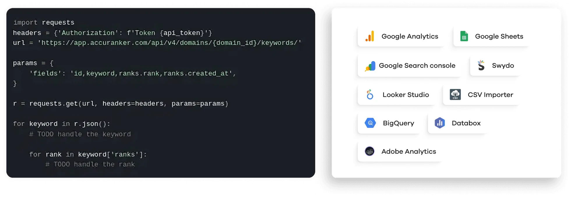 Get unlimited API access and connect with other toolsAccuRanker’s API and integrations automate data retrieval and streamline your SEO analysis. Seamlessly connect AccuRanker data to your dashboards and existing tech stack and get complete control over how and where you use your SEO data.